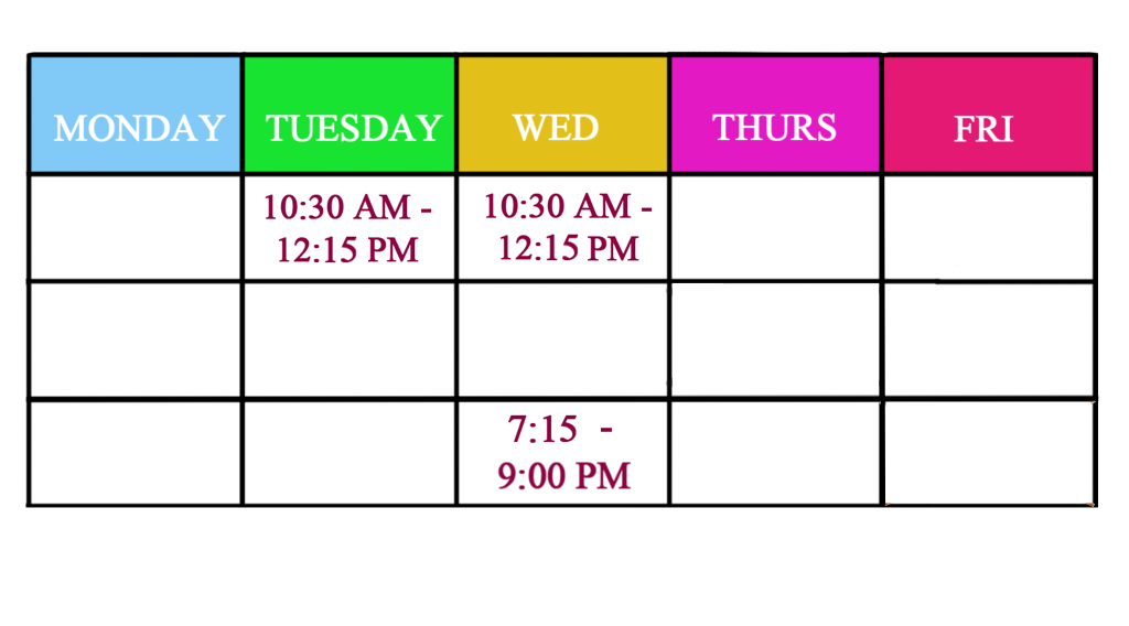have two slots, 10:30 am and 7:15 pm Wednesdays.